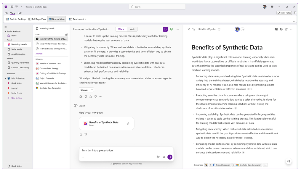 - Rascunhe com mais inteligência: gere resumos, ações e rascunhos com base no conteúdo que você selecionou no seu caderno. O Copilot adapta suas respostas ao que você adicionou, tornando a elaboração mais rápida, fácil e relevante;